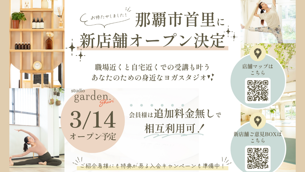 お知らせ2026年1月30日【沖縄ヨガスタジオ The Garden】Gardenがいよいよ那覇市首里エリアにOPEN!studio garden shuri で、新しい“日常”を見つけませんか?