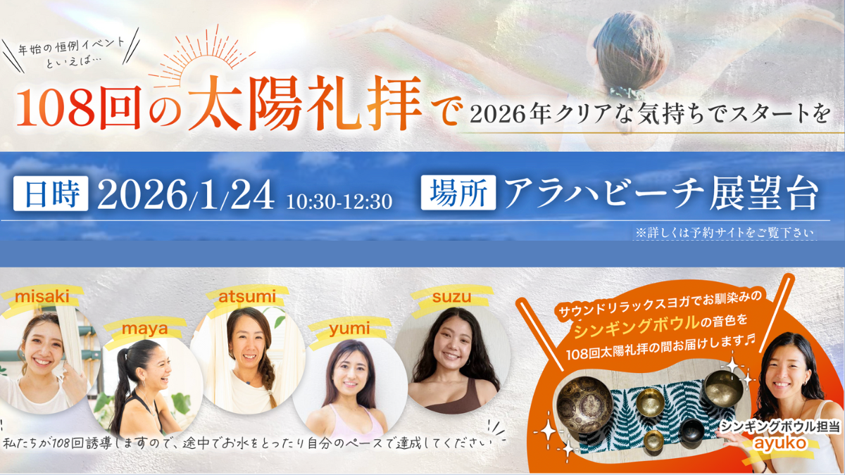 お知らせ2025年12月20日【沖縄ヨガスタジオ The Garden】新春恒例イベント|108回太陽礼拝で、2026年をクリアな心と身体でスタートしよう!!